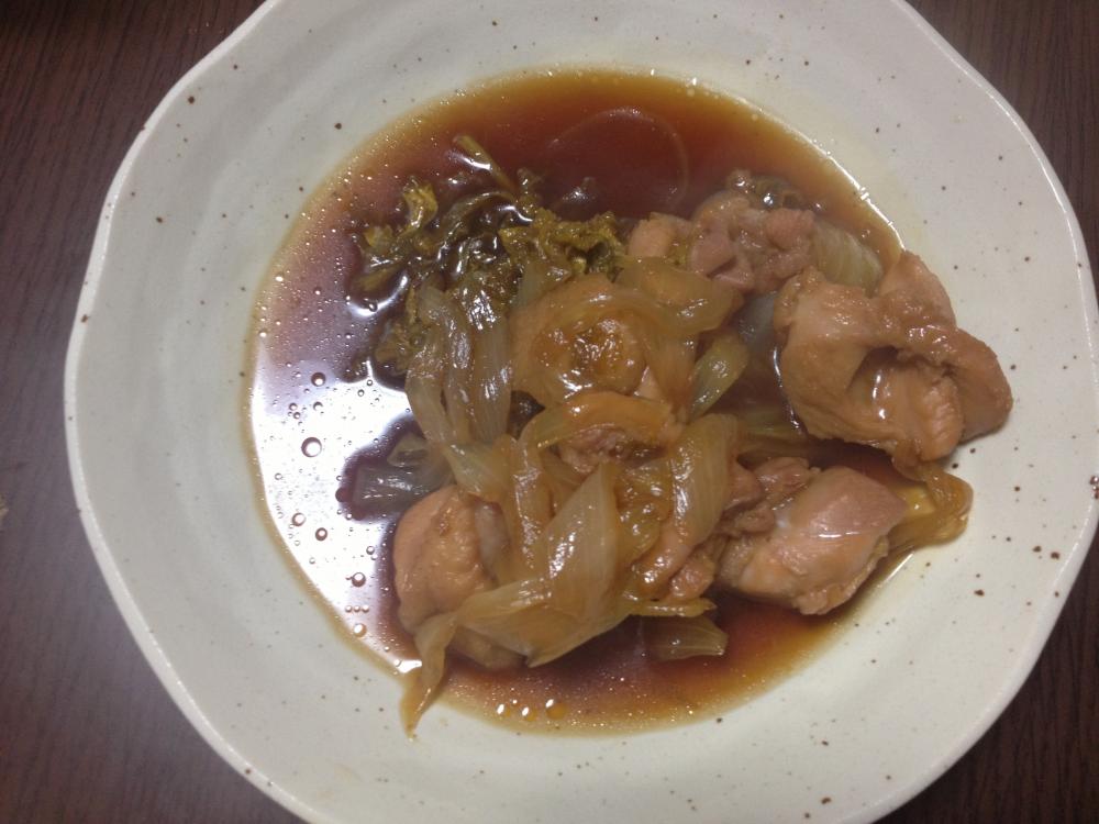 たまねぎに火が通ったら、鶏肉を戻しいれ、調味料を絡めてできあがり。