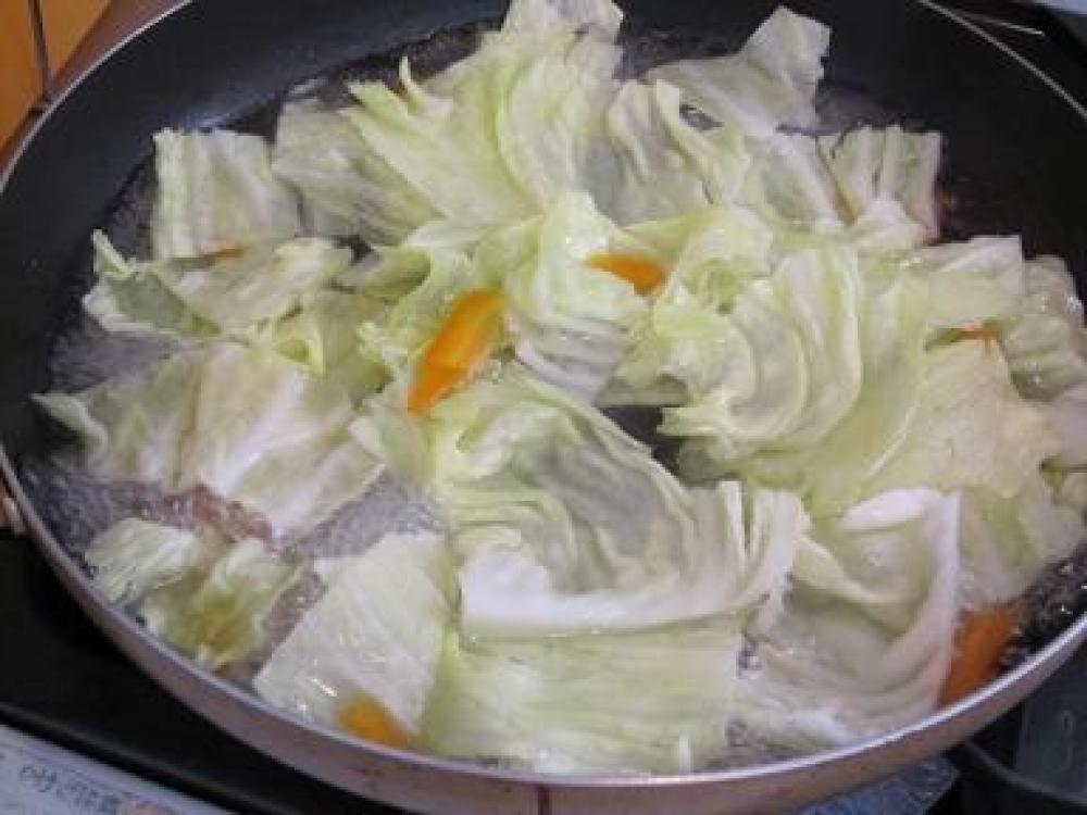 ![]() フライパンにAを入れて沸騰させ、ニンジン、キャベツを入れてさっと茹で、キャベツをザルにあげる。
