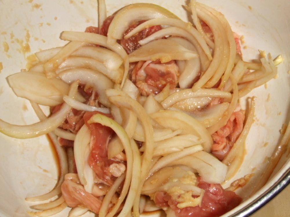 ![]() 玉ねぎは薄切りにする。豚肉と玉ねぎを★印と合わせ、10分ほど置く。