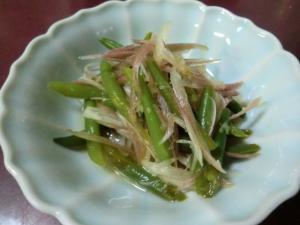 インゲンは、塩を加えた熱湯で茹で、冷水に取って水気を切り、斜めうす切りにします。ミョウガは、うす切りにします。
