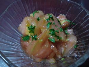 1のトマトを、3のレモンオイルと合わせて、全体をザックリと混ぜます。冷蔵庫に入れて、しばらくなじむまで寝かせます。