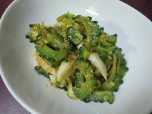 1のゴーヤを熱湯でサッと茹で、冷水に取って冷まし、水気を切ります。