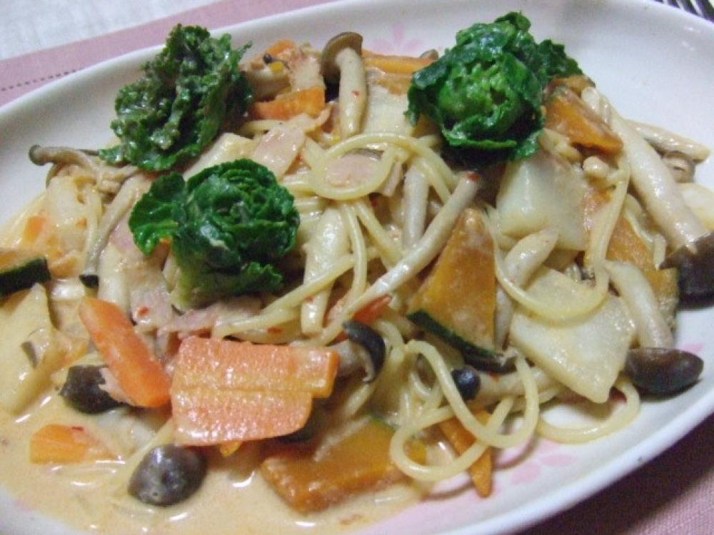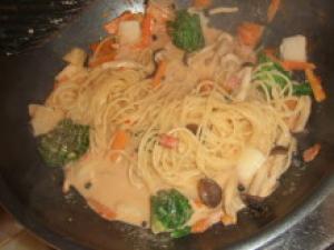 ![]() パスタを茹で、フライパンにごま油を熱して、(1.)を炒め、★マークの材料とプチヴェールを入れて、野菜に火を通す。