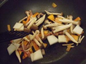 かぶはイチョウ切り、にんじんは短冊、かぼちゃは薄切り、ベーコンは細かく切り、しめじはたべやすく分ける