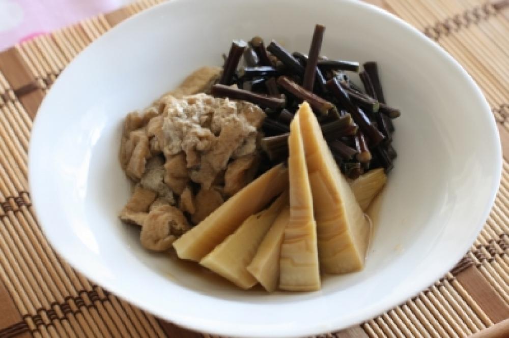 鍋に、出し汁とラカントS液状S、酒を加え火にかけ、沸騰すれば、わらび、筍、油揚げを加え、弱火にして、15分煮る。