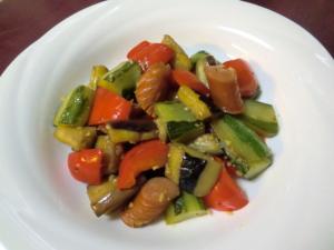 ナスはヘタを取り、所々皮をむいて縦4つ割りにし、3cm長さに切ります。塩少々をまぶして5分ほどおき、水気を拭きます。