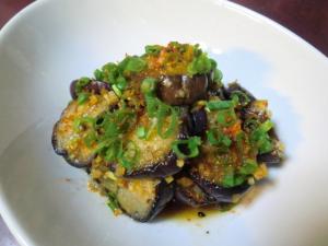 フライパンにゴマ油を熱し、水気を切ったナスを両面焼き色がつくまで焼きます。