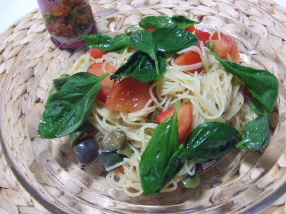 ![]() 茹であがったパスタを氷水で冷やし、(2.)に加え、スパイスドレッシングを入れ混ぜる。器に盛り、バジルを散らす。