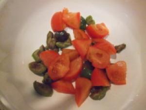 ![]() パスタを茹でている間に、トマトを食べやすい大きさに切り、オリーブは種を除いて、食べやすい大きさに切り、ボウルに入れておく