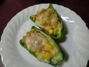 1のコーンとツナを合わせ、軽く塩、コショウを振り、1のピーマンに詰めます。