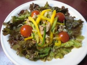 ボウルに3、4、よく混ぜ合わせたBを合わせて、手でよくもみ混ぜます。器にレタスを敷き、盛りつけます。