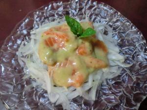 サーモンをうす切りにしてボウルに入れ、2のマリネ液を加えて混ぜ合わせます。