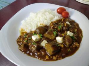 器にごはんを盛り6のカレ-をかけ、パセリを散らし、トマトを添えます。