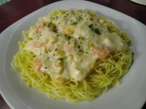 フライパンにバターを溶かし、うす切りにした玉ネギ、エビ、コーンを炒めます。
