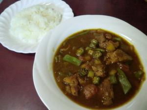 7の鍋を再び中火にかけ、インゲン、トマト、オクラを加えてアクを取り、混ぜ合わせながら5分ほど煮ます。