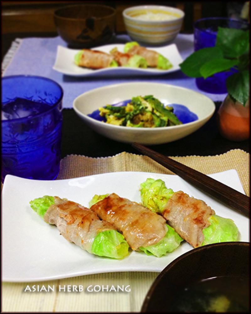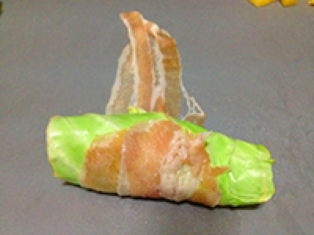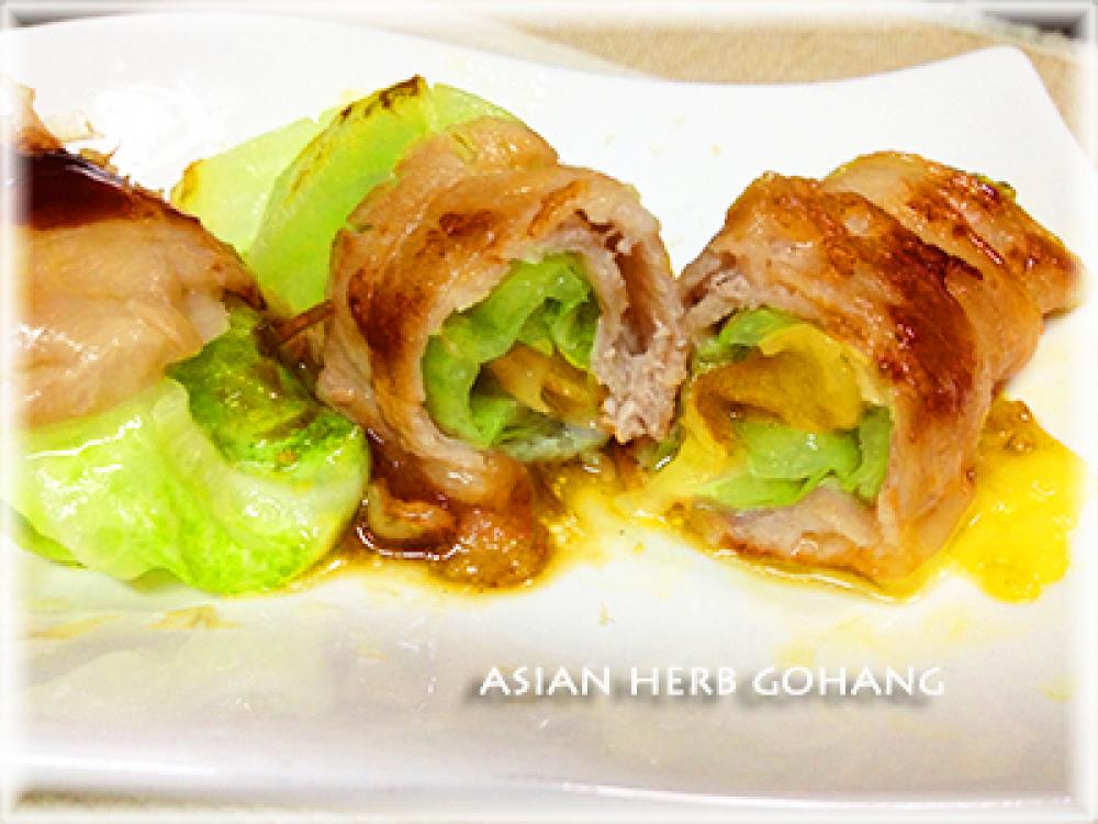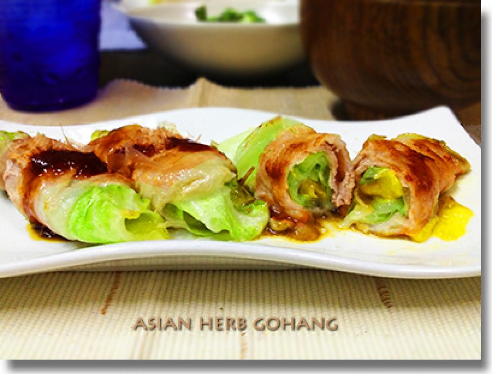 ![]() キャベツの中央にチーズを置いてくるくる巻いたらその上から豚バラで巻き、巻き終わりを下に置きます。