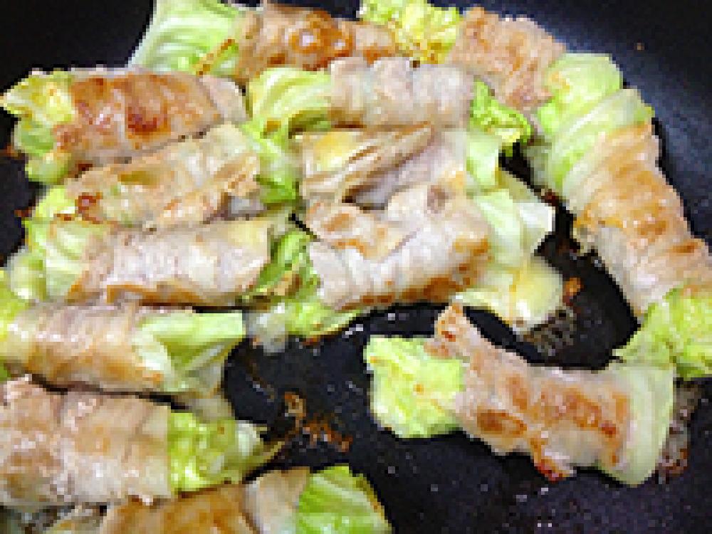 ![]() 強火にかけたフライパンに油を薄くひき、巻き終わりを下にして置き、豚バラが色づくように時々ころがしながら焼きます。