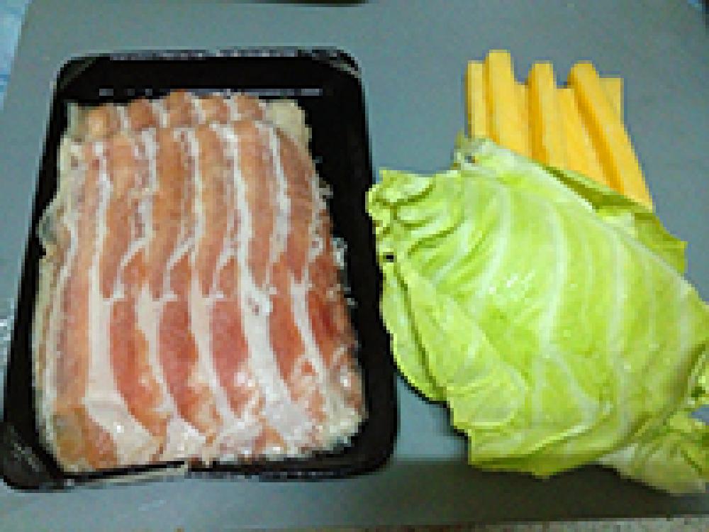 ![]() キャベツは葉軸を切り取りたで半分に切ります。豚バラに塩こしょうをかけます。