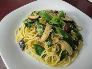 ニンニクの香りが出てきたら、シイタケ、シラス干しを加えて軽く炒め、茹で上がったパスタ、1のインゲンを入れてからめます。