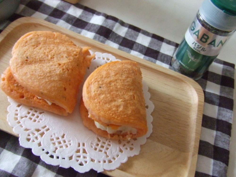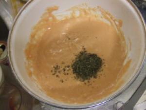 ![]() トマトジュースと卵を混ぜ合わせ、ボウルに入れたホットケーミックス・バジルと一緒に混ぜる。