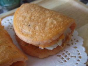 ![]() クリームチーズを半面に乗せ、半分に折る。