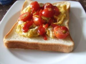 食パンをトーストする。フライパンに油を熱し、(1.)を入れて、半熟状態まで炒める。