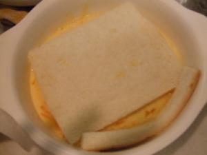 ![]() 食パンは耳を切り、中を袋状にする。★印の材料を混ぜて、食パンを両面よく浸す(15分くらい)