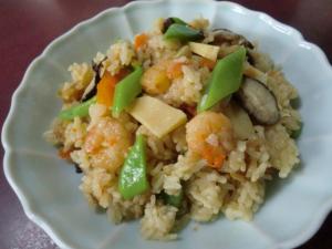 炊飯器に1の米、2のむきエビ、シイタケ、ニンジン、タケノコを入れ、だしの素、Bを加えて混ぜ合わせ、炊きます。
