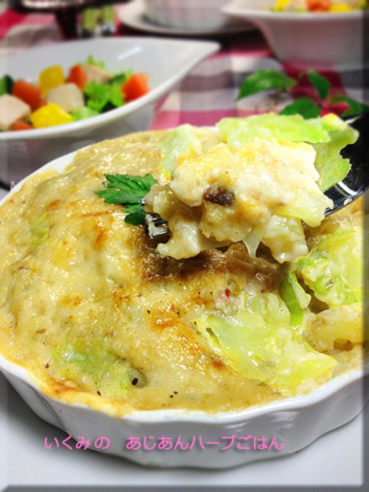 豆乳も入れてふつとしてとろみがついたら塩胡椒で味を整えキャベツを戻し入れ一混ぜしたら予めバターを塗ったグラタン皿に入れる