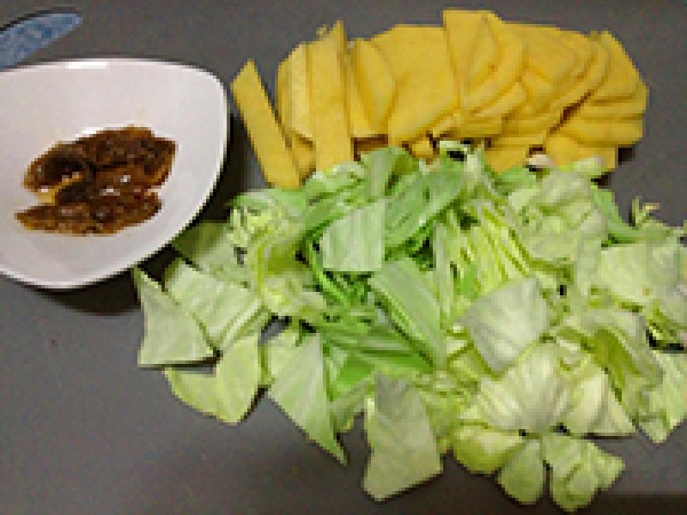 ![]() じゃがいもは4cmX5mm幅の細切りにし、水にさらしてレンジで3分加熱し、キャベツはざく切りにんにくはみじんに切る。