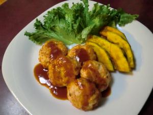 鍋に油を熱し、2のミンチボールを色よく揚げます。(ここで付け合せ用のカボチャは素揚げにしておきます。)