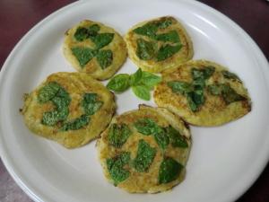 フライパンにオリーブ油を熱し、4を薄くのばし、バジルをちぎってのせ、両面キツネ色に焼きます。
