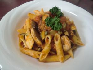 トマト缶をつぶしながら加え、半量になるまで煮詰め、ケーパー、パセリを加えて混ぜます。