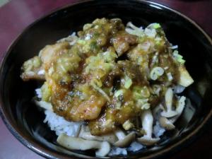 丼にアツアツのご飯を盛り、シメジをちらし、5の肉をのせて、お好みで七味唐辛子をふります。