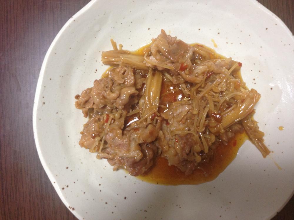 鍋に豚バラとエノキを入れる。調味料と水を入れ、水分が少なくなるまで煮込む。