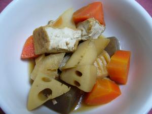 れんこん・ごぼうは一口大に切ったら、酢水につけておく。 生揚げ・こんにゃくはさっと茹でておく。 |