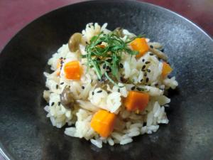 炊き上がったら全体を軽く混ぜます。器に盛って、ゴマを散らし、青ジソを添えます。
