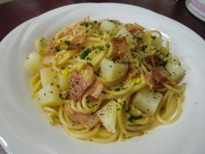 3のスパゲティー、ジャガイモを加えてザックリと混ぜ、バター、塩で味を調えます。