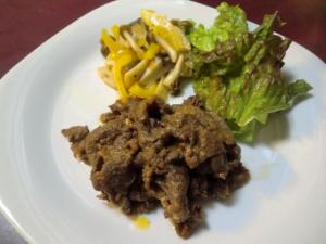 器にレタスをおいて、3の牛肉を盛り、シメジ、エリンギとパプリカをソテーしたものを添えます。