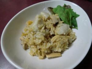 炊き上がった3の全体を混ぜて、器に盛り、ベビーリーフを添えます