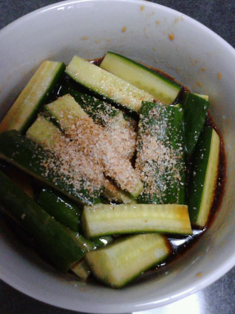 すりごまをふり、軽くゆすって30分ほど馴染ませます。 |