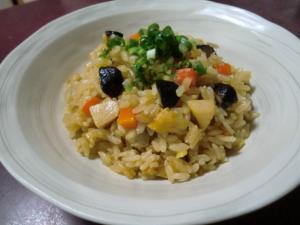 香りが出たら2のニンジン、シイタケ、タケノコ、油揚げを入れて炒め、1のお米も加えてさらに炒めAの調味量で味付けをします。
