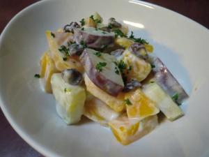 サツマイモ、カボチャ、レーズンを4のドレッシングで和えます。