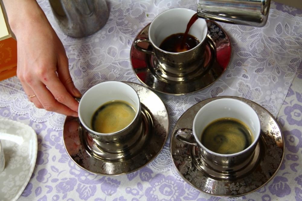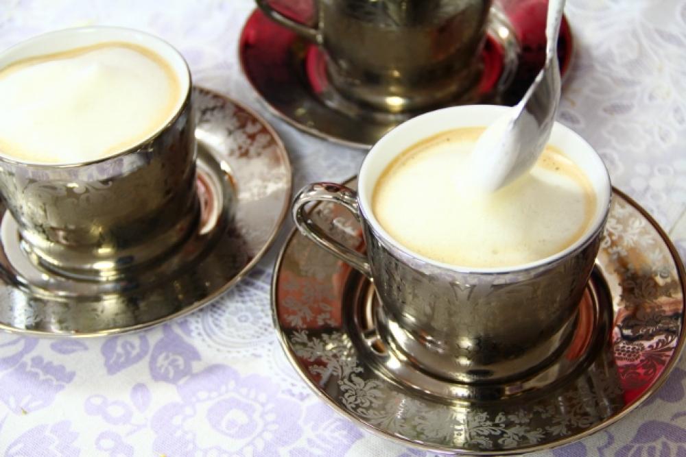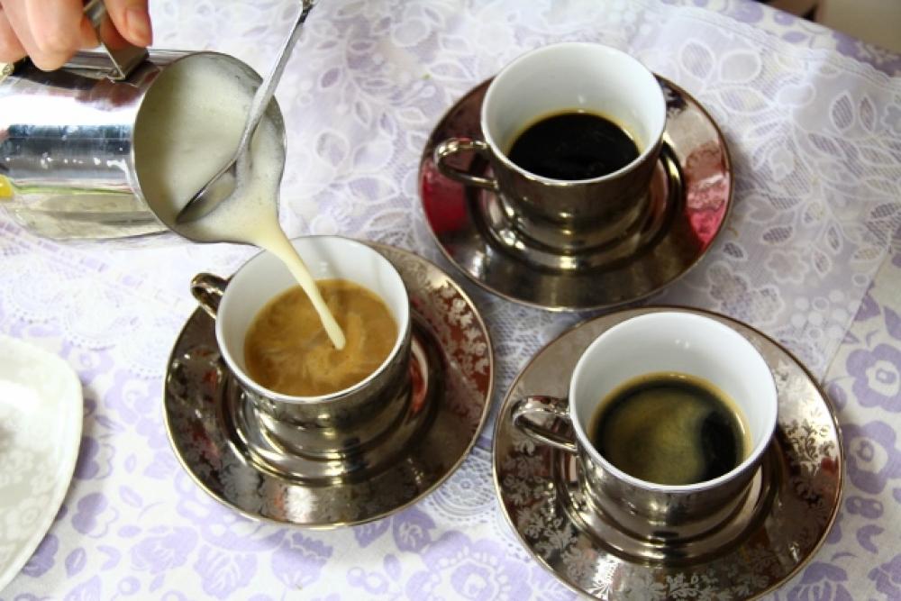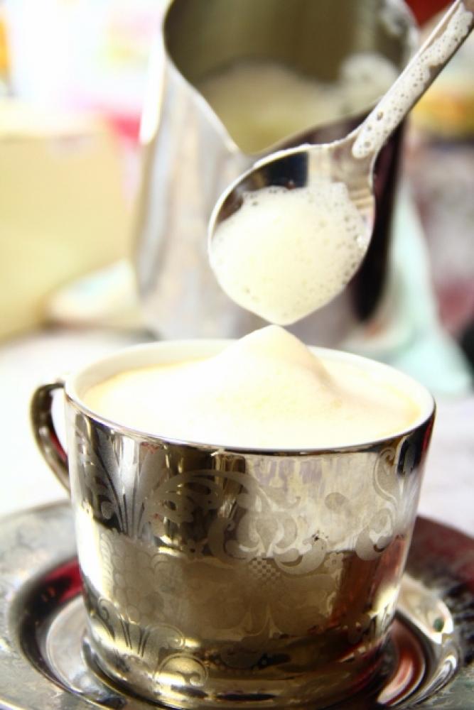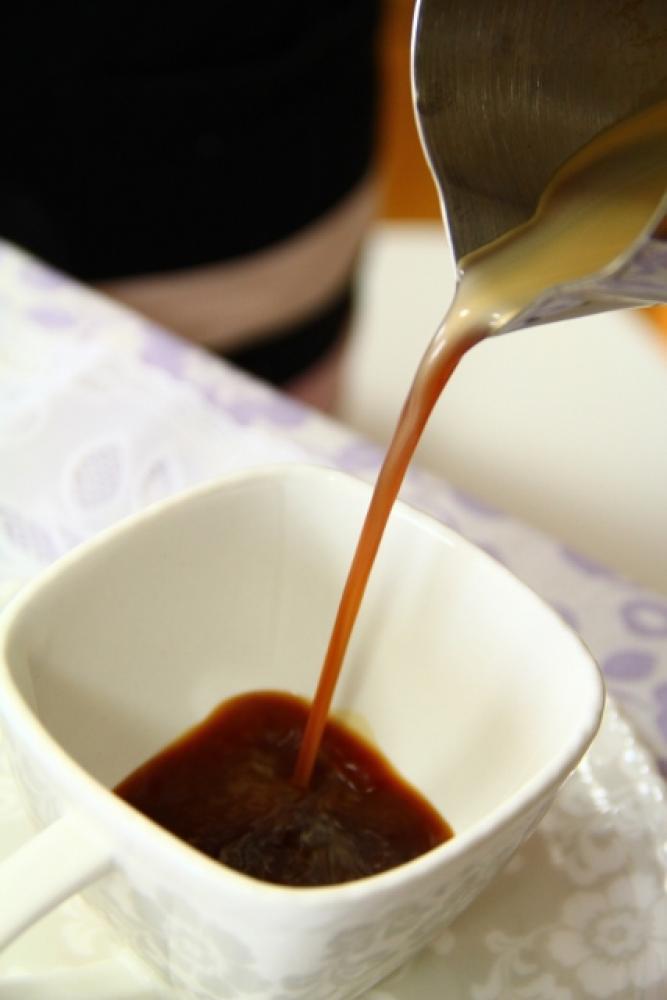 ![]() エスプレッソと温めた豆乳をカップに注ぎます。(このとき、泡立てると口当たりが、更に良くなります。)