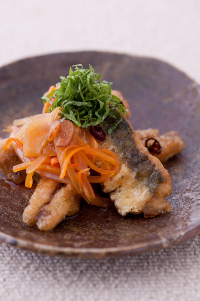 南蛮酢に揚げたサーモンを漬け込む。