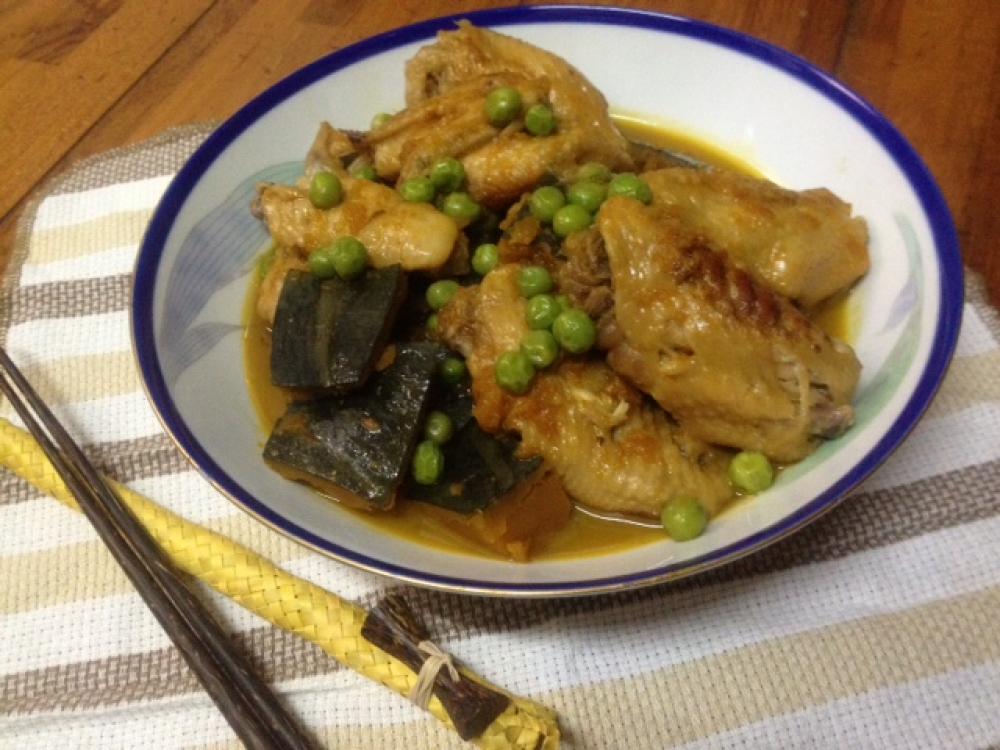 手羽先を圧力鍋に油を入れ表面を焼きます、焼き色がついたらカボチャも入れ全体を混ぜます。