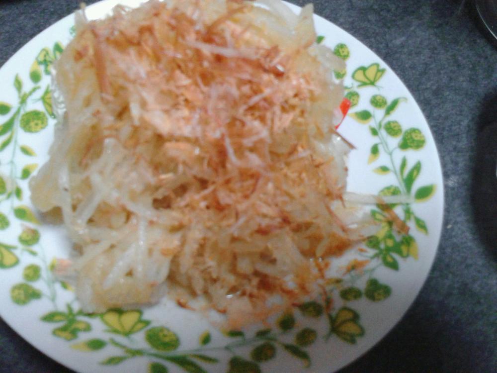 大根は千切りに、新玉ねぎは薄くスライスします。