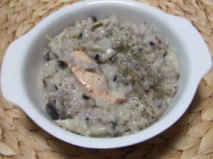 鍋に豆乳・水・コンソメを入れ火にかけ、温まってきたらしめじを入れ、鍋の端がフツフツとしてきたら、ごはんを加えて、混ぜる。