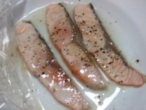 ![]() サーモンは、耐熱皿に入れ、ワイン・ブラックペパーをふりかけ、ラップをして500Wのレンジに1分かける。