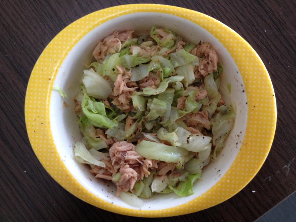 キャベツは千切りにして、電子レンジでチンする。キャベツにツナ缶を入れ、和える。